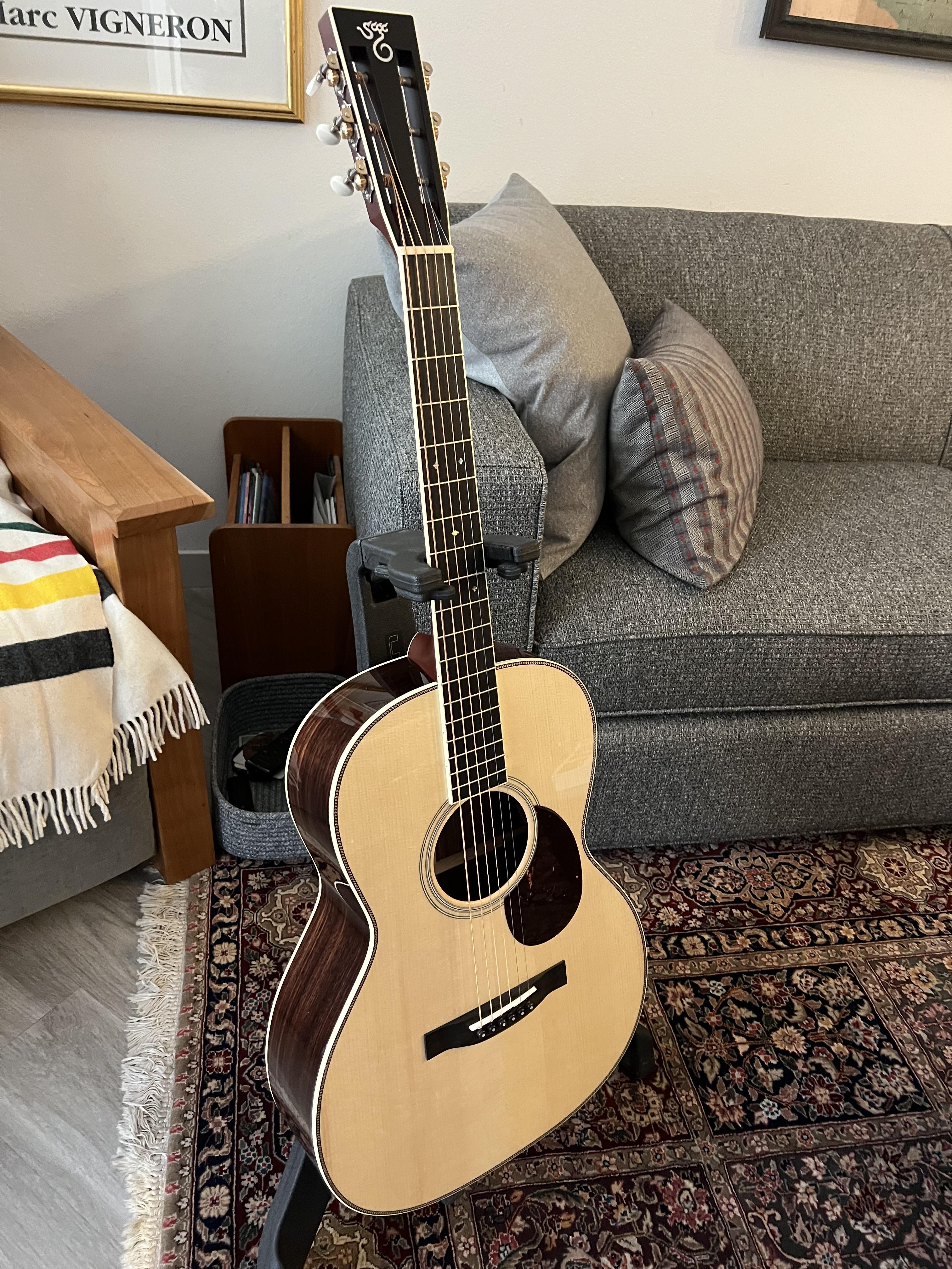 I have many guitars, but only one Santa Cruz. I have a custom FS with an Italian Spruce soundboard from Rudi Bachmann in Italy and a California Claro Walnut back and sides. It has a 25-3/8” scale, 1-3/4” nut and 2-5/8” string spacing. It came strung with parabolic low tension strings, but sounds better to me with standard light gauge stings or parabolic medium tension strings.