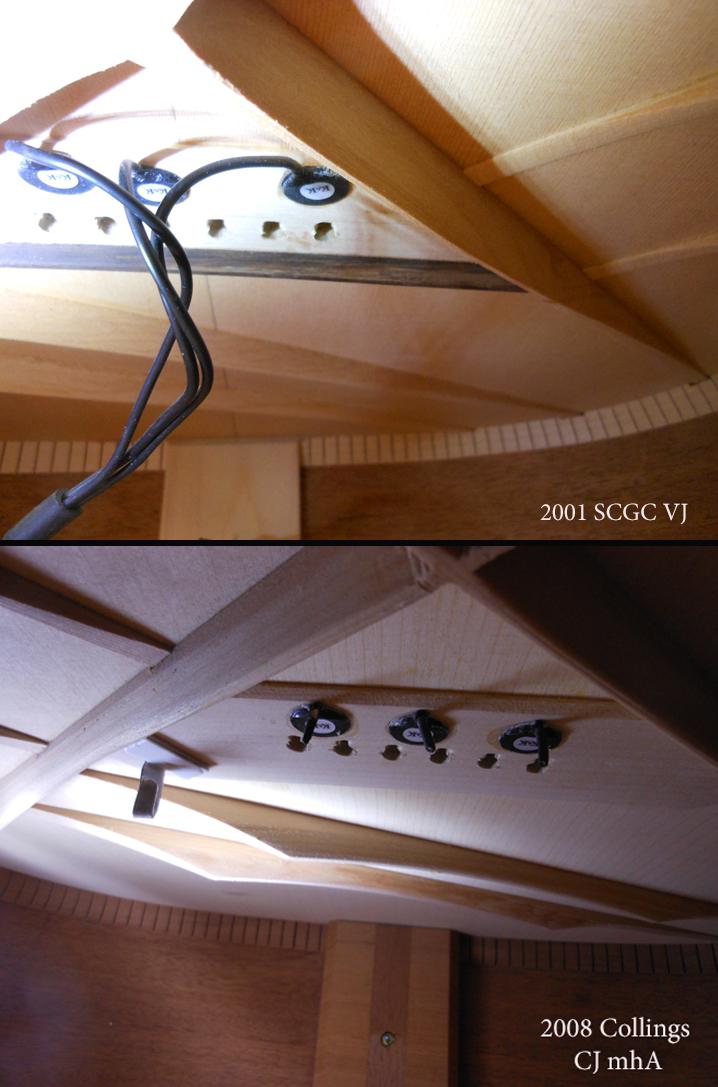 They both are honduran mahogany with the diff spruce, sitka VJ and red spruce CJ. The VJ is full scale and CJ is short scale. The VJ has tapered xbrace and tone bars, the CJ has scalloped xbrace and tone bars. The CJ is loud and punchy but can have a tamed warmth using a lighter touch. Light gauge Curt Mangan round core strings on the VJ. Lights can’t drive the red spruce top of the CJ, so D’Ad True Medium EJ24s. note: the old style K&K is being replace with a new one…. sometimes along the way. 02c bert